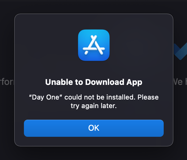 Towards the end of December, the MacOS App Store notified me of an update for the Day One app. Every attempt I made to install the update failed. On both of my MacBooks. I made sure to quit the Day One app and the Day One menu bar extension, but every attempt to run the update failed without any kind of error message.