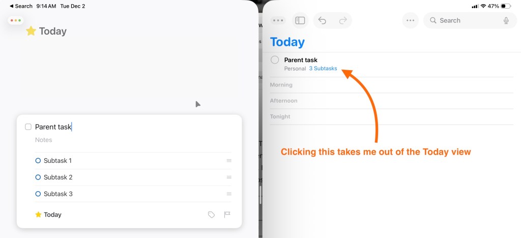 I know–in the other post I said it was missing a bunch of features. Turns out, I don’t really need those features in a personal task manager. I need a quick way to enter tasks and subtasks. Apple Reminders hasn’t mastered the subtasks thing yet. They’re there… But I live in the Today view, and Things just does it better. In my opinion, taking me out of Today view to view subtasks is inefficient.