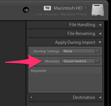 When importing, use a Metadata preset to quickly add your copyright and creator (or any other) information to all imported photos.